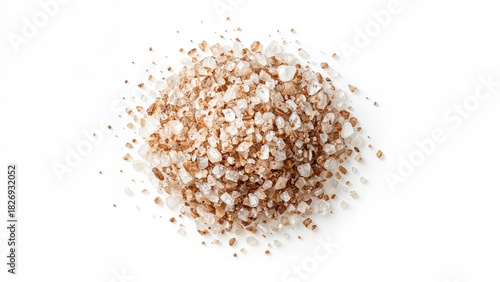 Pile of brown sugar or salt crystals on white background. Dispersed grains and granular texture. Food ingredient or seasoning concept.