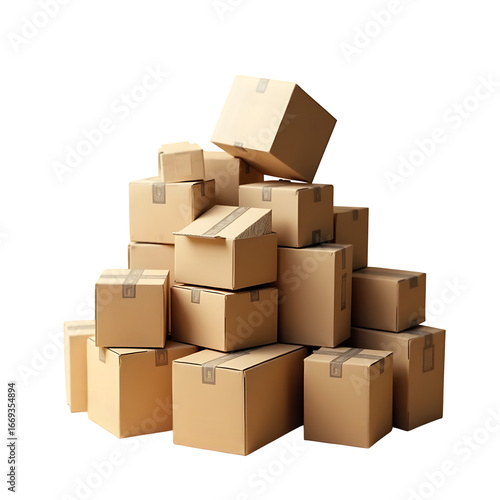 Pile of cardboard boxes stacked high for shipping and storage transportation logistics transparent background