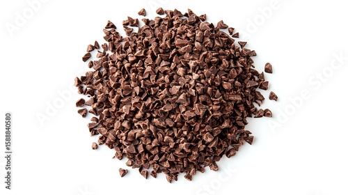 Pile of dark chocolate chips scattered on white background, isolated food ingredient for baking and confectionery. Clean macro shot with sharp details.