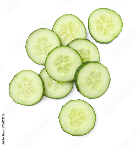 Pile of fresh cut cucumber isolated on white, top view
