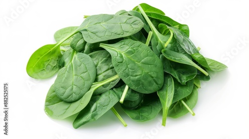 Pile of fresh green baby spinach leaves isolated on white background. Close up. Flat lay. Food concept. Macro concept