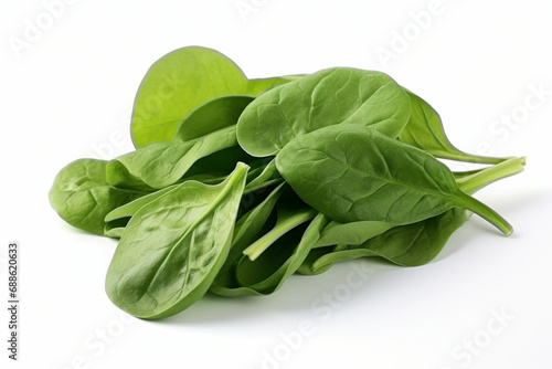 Pile of fresh green baby spinach leaves on a white background