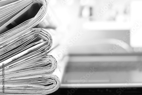 Pile of fresh morning newspapers on the computer. Latest financial and business news in daily paper. Pages with information (headlines, articles, photos, text). Folded and stacked journals