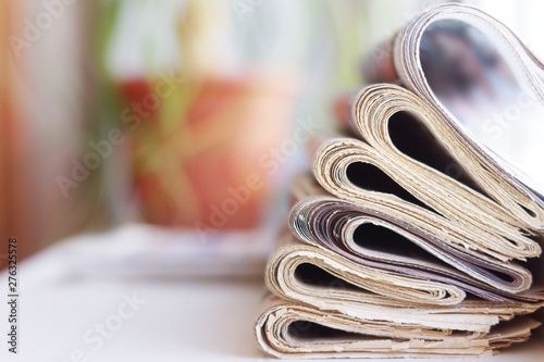Pile of fresh morning newspapers on the table at office. Latest financial and business news in daily paper. Pages with information (headlines, articles, photos, text). Folded and stacked journals
