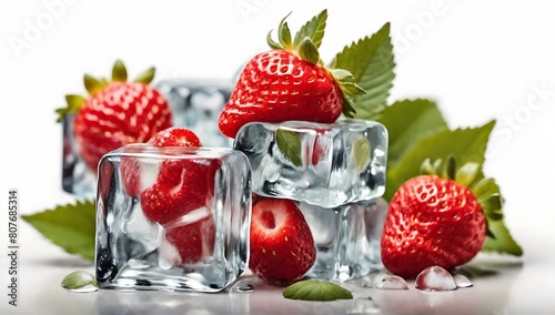 pile of ice cubes and fresh strawberries. delicious fruit juice. isolated on white background.