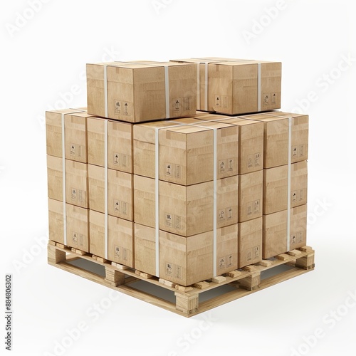 Pile of medium cardboard boxes no labels stacked on a regular transportation and storage wooden pallet isolated on white background