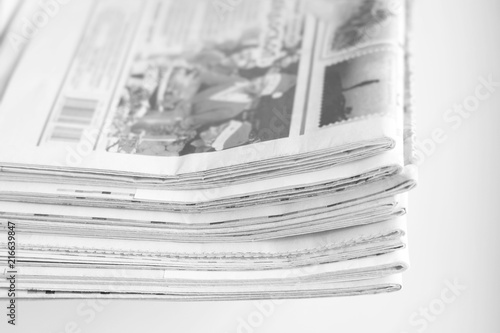 Pile of newspapers, folded and stacked journals. Papers with news (headlines and articles), selective focus