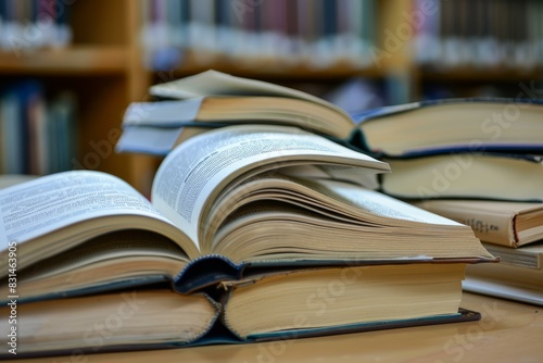 Pile of open hardcover books stacked on a wooden desk in a library setting