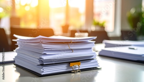 Pile of Paperwork on Desk in Bright Office with Clip Rubber Band Documents.