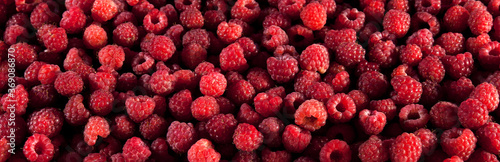 Pile of red ripe raspberries. Background and texture. Panorama.