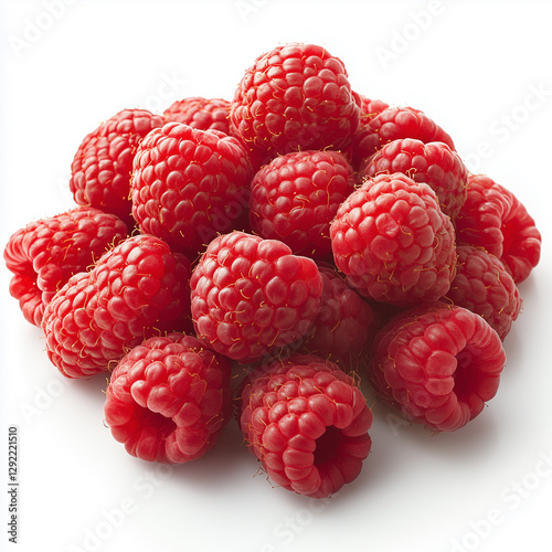 Pile of ripe, juicy raspberries with vibrant red color, isolated on a white background, highlighting their natural freshness.