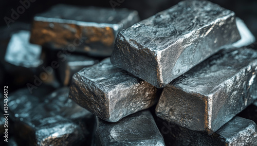 pile of shiny silver ingots is stacked on dark background, showcasing their metallic texture and reflective surface. close up view highlights ingots smooth edges and industrial feel