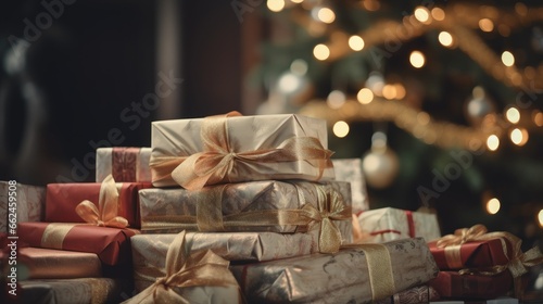 Pile of wrapped Christmas presents with a sparkling Christmas tree blurred in the background