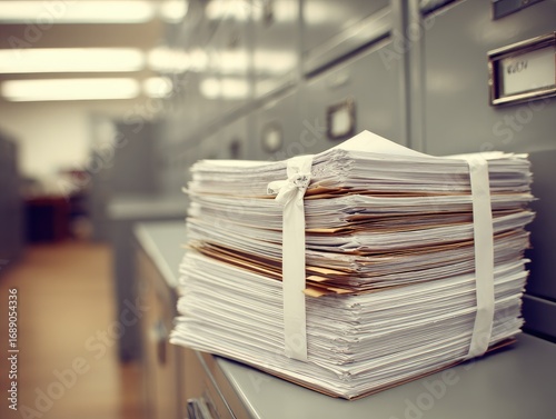 Piles of paper secured by string sit atop gray filing cabinets in a long corridor, bathed in soft overhead light, evoking bureaucracy and organization