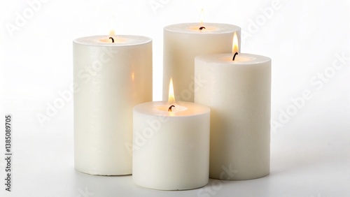 Pillar candles with flames illuminated, cut out on white