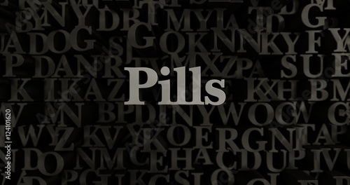Pills - 3D rendered metallic typeset headline illustration. Can be used for an online banner ad or a print postcard.