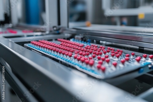 Pills being processed on a conveyor belt in a pharmaceutical manufacturing facility