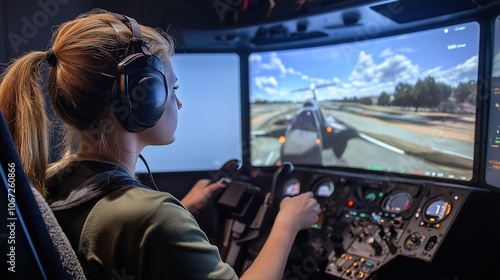 pilot trainee in a flight simulator, focused on the controls