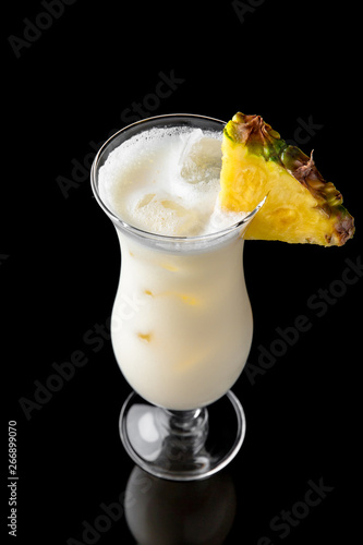 Pina Colada. Alcoholic or non-alcoholic cocktail with orange citrus, pomegranate with the addition of liqueur, vodka, champagne or martini. Cool drink isolated on black background