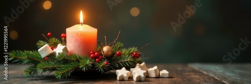 Pine branch vase with twinkling candle and marshmallows, cozy, Christmas