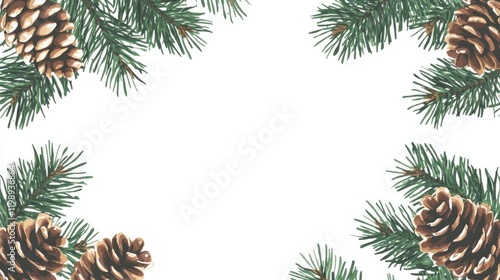 Pine branches and cones frame with white background for text copy space seasonal design elements