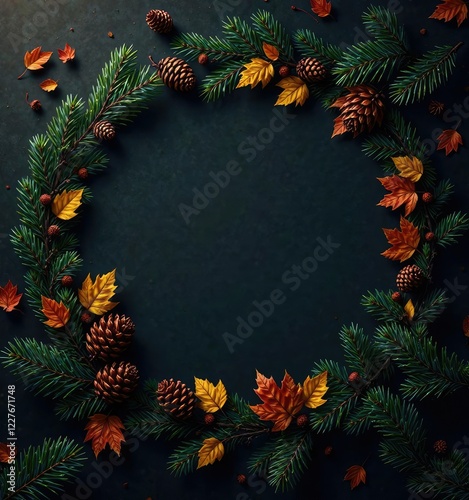 Pine branches are arranged in a circular pattern, framing a dark background adorned with fall leaves and pine cones , Dark Background, Pine Cones