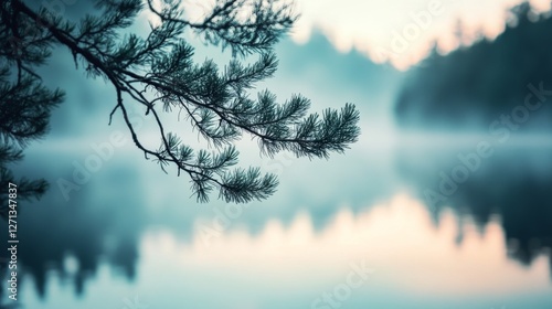 Pine branches extend over a misty lake at dawn, encapsulating a serene and dreamy landscape in soft pastel hues.