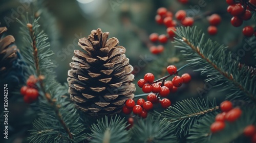 pine cone and red berries on evergreen branches