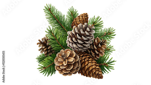 Pine Cones and Green Pine Branches Arranged Together on a Transparent Background