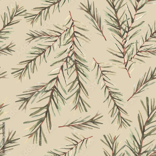 Pine or fir tree branches watercolor winter seamless pattern. Spruce evergreen with needles. Christmas tree twig painted illustration for fabric, wrapping paper on isolated beige coloured background