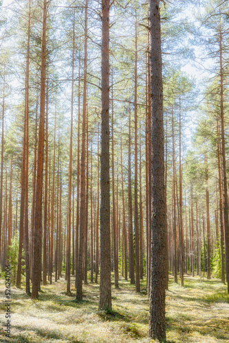 Pine tree forest landscape. Forest therapy and stress relief.