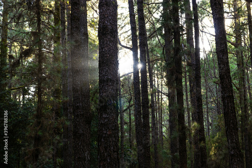 Pine tree forest with the sun rays shining through the trees, Tenerife