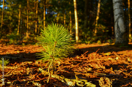 Pine tree sapling on a forest floor illuminated by warm light