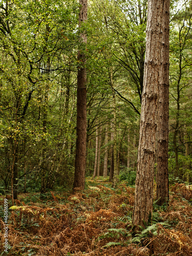 Pine trees in a forest with a path at Newmiller Dam in Wakefield, West Yorkshire.