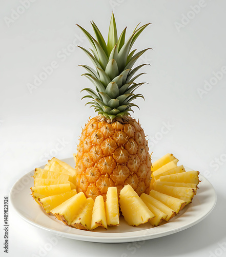 Pineapple wedge carved into fan-like slices, still attached at the base, presented on a white plate, elegant food styling on a white background.