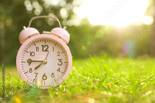 Pink alarm clock on green grass outdoors. Space for text
