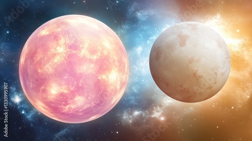 Pink and Orange Glowing Planet and Grey Moon in Cosmic Space