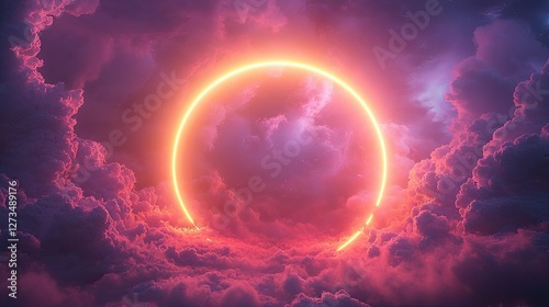Pink and orange neon arc emerging from fluffy clouds, lighting up the twilight sky.