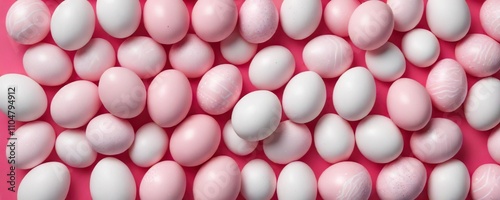 Pink and white Easter eggs arranged in a pattern on a vibrant pink background, festive decor, Easter tradition