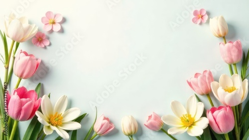 Pink and white tulips and small pink flowers create a floral border on a light blue background, with open space in the center. Concept of a floral spring frame.