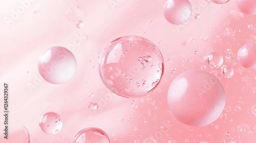 Pink background with collagen cell pattern for skin care concept. Realistic 3d vector illustration with oil ball drop and liquid cosmetic sphere with molecule inside. Face and body moisture essence.