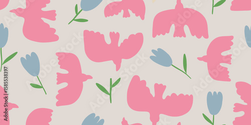 Pink Birds and Blue Flowers Playful Seamless Pattern