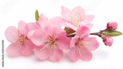 Pink blossoms on branch used to depict spring arrival, a symbol of beauty and renewal in design projects on plain background