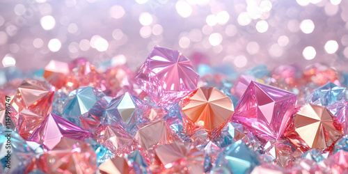 Pink, Blue, and Peach Crystal Cluster Abstract Background, Sparkling Gemstone Texture, Iridescent and Shiny Facets, Luxurious Jewel-like Surface