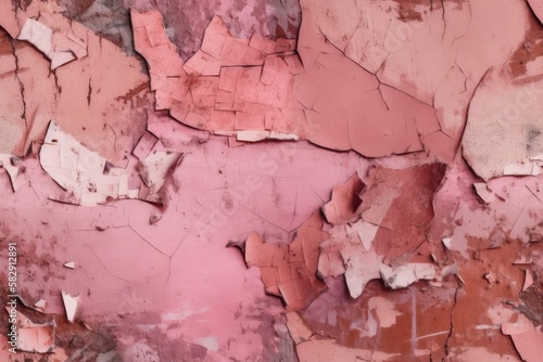 Pink cement that is fractured and textured with a vintage old style plaster background. painted surface with a faded, pastel, rosy appearance. Top rough, red, vacant, brushed sand, crack. Generative