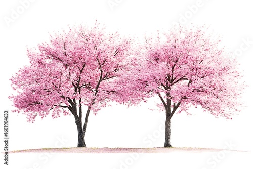 Pink cherry blossom trees in full bloom on a white background for spring season