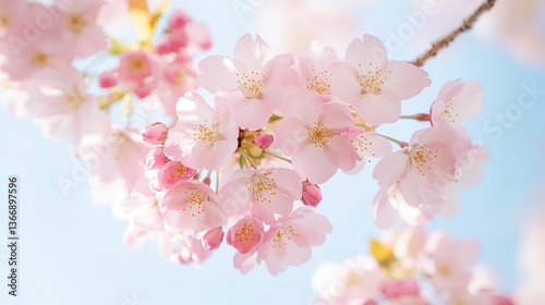 Pink cherry blossoms in full bloom under clear blue sky, with close - up of delicate petals and vibrant colors, creating an elegant and serene atmosphere.
