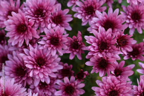 Pink Chrysanthemum selectively focused. Close up of Chrysanthemum flowers. Flower head. Bouquet of pink autumn chrysanthemum. Summer flowers. Top view. Texture and background. Floral background