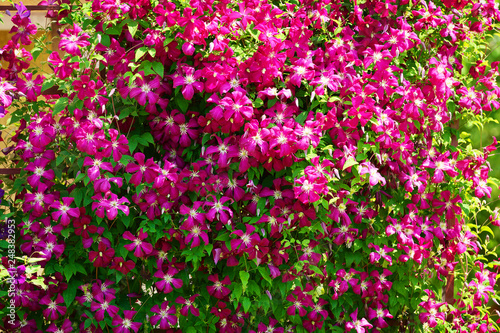 Pink clematis flowers blooming on shrub in sunlight. Spring garden in blossom.