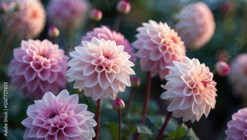 Pink dahlias in full bloom with layers of petals and green foliage in a garden setting, soft natural lighting, Copy Space